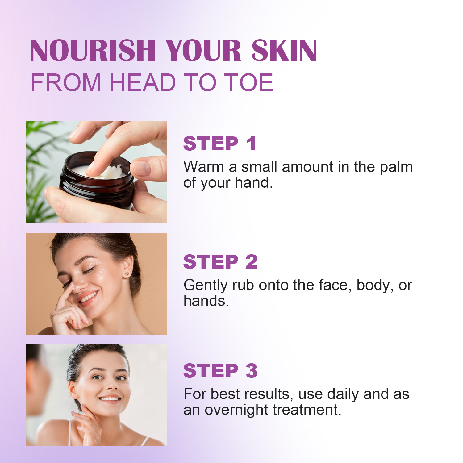 2. Warm: Rub between palms to melt the texture.